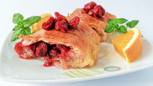 Potrebno je: 6 kora za pite i baklave; 500 gr višanja; 400 ml vode; 400 gr šećera; 2-3 koluta pomorandže; vanilin šećer; 2 jaja; 2 sk šećera; 100 ml ulja; 70 gr griza; 150 ml jogurta; 10 gr praška za pecivo.