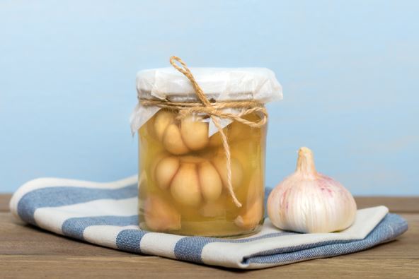U manjoj posudi zagrejte sirće, šećer i so, pa pustite da provri, dodajte začine i još vruće prelijte preko čenova belog luka koje ste gusto složili u prethodno sterilizovanu teglicu.