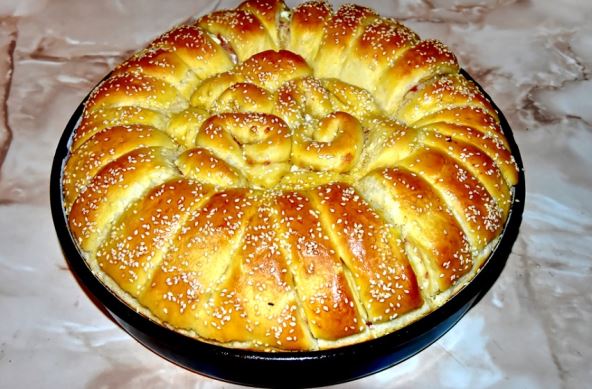 Premazati pogaču umućenim jajetom i posuti susamom. Na kraju, na pogaču nasumično stavljati komadiće margarina. Prekriti tepsiju kuhinjskom krpom i ostaviti pogaču da odstoji 30-ak minuta. Peći 45 minuta u rerni zagrejanoj na 220 stepeni. Poslužiti toplo.