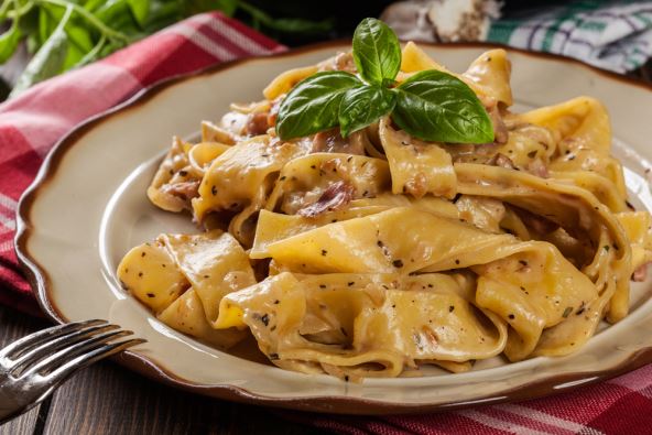 Priprema: Na malo maslinovog ulja dinstajte kratko preprženi beli luk i seckanu slaninu. Ne sme biti prepržen ili hrskav, samo treba pustiti malo masnoće, pa mu ubrzo dodajte pasirani paradajz. Testeninu skuvajte u posoljenoj vodi da bude al dente, ocedite i sačuvajte malo vode od kuvanja. Testeninu dodajte u sos, pa po njoj narendajte kačkavalj, ako je potrebno, dodajte malo vode od kuvanja.