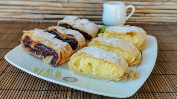 Potrebno je: 1 l mleka; puding od vanile; puding od čokolade; 4 kk meda; 2 sk griza; 50 ml ulja; 200 ml kiselog mleka; 10 gr praška za pecivo; 2 jaja; 2 sk šećera; 6 kora za pitu