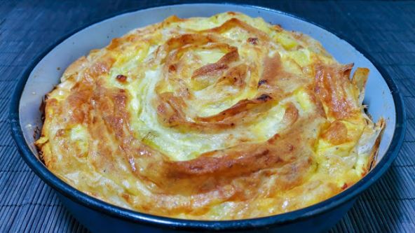 Priprema: Skuvajte krompir u ljusci. Na masti propržite praziluk i slaninicu, oljuštite krompir i isecite i dodajte sa prazilukom. Namažite koru sa mašću, stavite fil, naborajte kore, uvite u krug i stavite u nauljen pleh na sredinu. Ostale kore isto filujte i naborajte, i ređajte oko sredine u krug. Umutite jaja, pavlaku, kiselu vodu i prašak za pecivo, prelijte pitu, pecite na 200 C - 30-35 minuta.