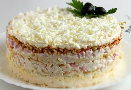 Za sledeći sloj treba naneti iseckane račiće, a preko njih krupno urendati jabuku, pa preko rasporediti iseckanu šunku. Sledeći sloj su krupnije samleveni orasi, a zatim poslednji sloj, rendana belanca pomešana s malo majoneza.