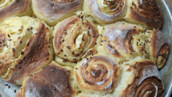 Nakon toga razvijte testo pa ga ga premažite maslacem i umućenim sirom i jajima. Umotajte rolat, pa isecite rolat na kriške. Kriške poređajte u pleh, pospite lanom ili susamom i pecite oko pola sata na 200 stepeni Celzijusa.