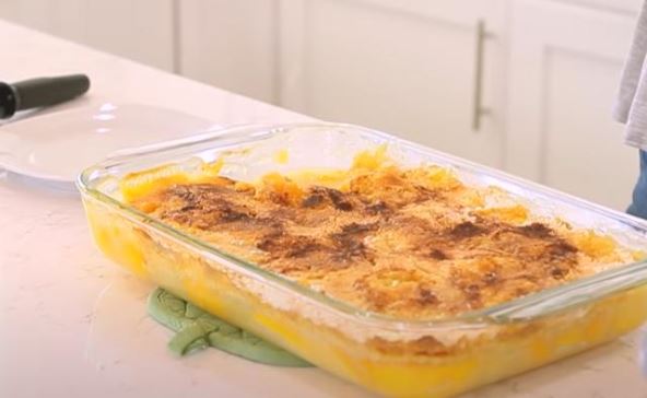 - U vatrostalnu posudu sipajte kompot od breskve zajedno s tečnošću.Umesto breskvi možete koristiti i kompot od ananasa.