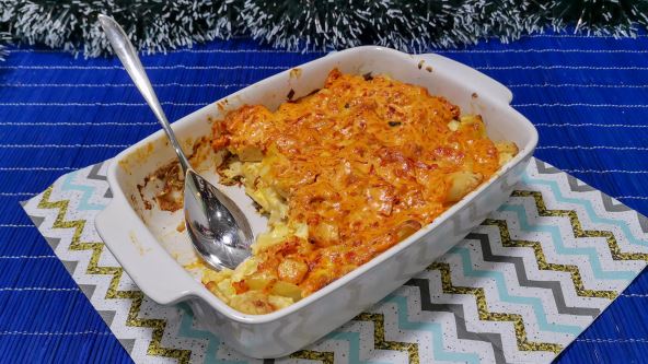 Priprema: Izdinstajte praziluk pa dodajte belo meso, na kraju dodajte masline. U isto vreme obarite testeninu. Kada je sve gotovo, proceite i pomešajte testeninu i meso i stavite u nauljen pleh.