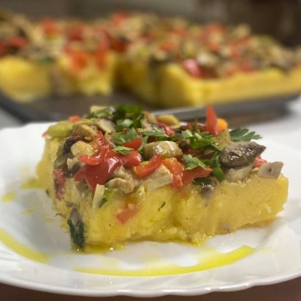 Priprema: Palentu skuvati u vodi u koju smo dodali so i maslinovo ulje. Presuti u podmazani kalup. Povrće iseći i propržiti na malo ulja. Staviti preko palente i zapeći u rerni 8-10 minuta. Po želji posuti peršunom i maslinovim uljem. Prijatno!