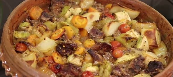 700 grama junetine iseći sto tanje i manje kockike, zatim je izmešati sa sitno seckanim belim i crnim lukom (po jedna glavica svakog), jedan krompir, 2 paprike, 1 tikvica, 1 šargarepa i sve se izmeša u jednom većem tiganju ili dubljem sudu. Staviti i čeri paradajz, sve posoliti i dodati slatku začinsku papriku i dodati malo ulja i 400 ml vode. Prekriti folijom i peći sat vremena, a zatim skinuti foliju i peći još 2 sata.