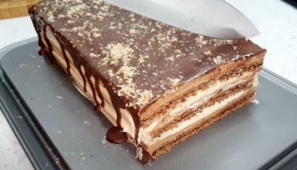 - Prva kora – čokoladni sloj – žuti sloj, zatim druga kora – čokoladni sloj – žuti sloj, pa treća kora – čokoladni sloj – glazura.