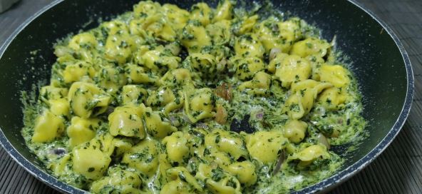 Priprema: Skuvajte torteline u vreloj vodi, 10 minuta. U tiganj stavite slaninicu, propržite. Izvadite iz tiganja. Dodajte luk i brikete spanaća.