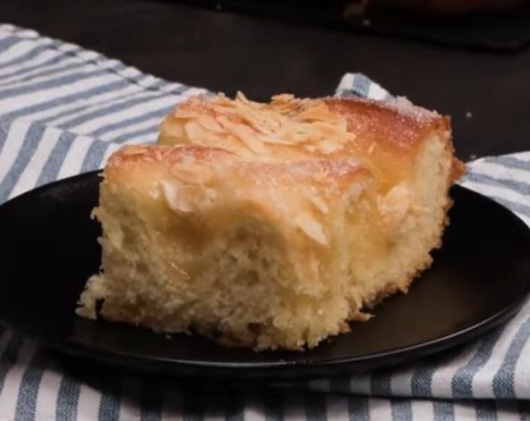 - Zatim, prstima napravite rupe u testu i stavite kockice putera (150 g) u njih, pospite šećerom i listićima badema.