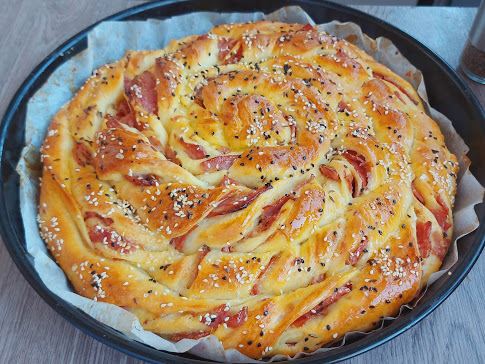 Prvo testo preklopiti tri puta pa ga nožem preseći na pola . Jednu polovinu uviti oko svoje ose i zaviti u krug na sredinu tepsije. Tako uraditi sa ostatkom testa. Pokriti i ostaviti da malo odstoji pa premazati žumancetom u koji ste dodali 1 kašiku ulja. Po želji posuti susamom.
