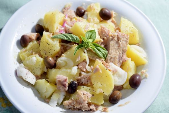 Luk iseckajte, dodajte ga krompiru i pažljivo promešajte. Pomešajte ulje, senf, seckan peršun i mirođiju, so i biber i sve izmešajte. Pomešajte preko krompira, dodajte tunjevinu i masline i promešajte.
