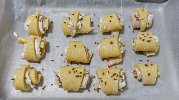 Priprema: Izrendajte sireve i otopite na pari. Dodajte bademovo brašno i umutite testo. Razvaljajte testo, premađite krem sirom i dodajte preko šunku. Secite u trougliće i uvijajte kiflice. Pospite susamom, lanom ili kimom, i pecite na 220 c - 12-15 minuta