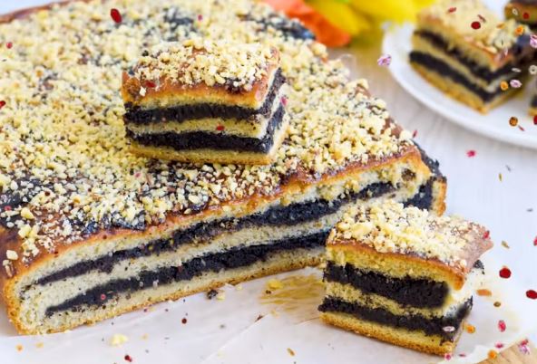 U mleveni mak dodajte džem, malo vruće vode i promešajte. Testo premesite, pa podelite na 3 jednaka dela. Pek papir isecite na veličinu 20×30 cm i pospite sa malo brašna. Stavite testo ne pek papir i oklagijom razvucite na veličinu papira. Pleh istih dimenzija obložite pek papirom, pa ubacite prvu koru i sipajte fil preko, zatim druga kora, fil, treća kora. Poprskajte poslednju koru sa malo tople vode.