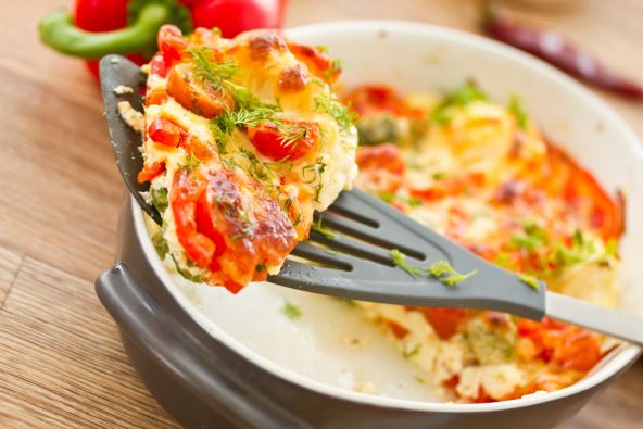 Razmutiti jaja, dodati pavlaku i parmezan, sve posoliti i pobiberiti. Za one koji volje ljuto dodati čili. Preliti povrće i zapeći u rerni (oko 25 minuta).