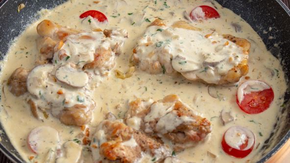 Dodajte belo vino, beli luk u prahu, i timijan. Stavite pavlaku za kuvanje, dižon senf i peršun. Dinstajte dok se sastojci ne sjedine. Vratite meso i dodajte čeri paradajz.