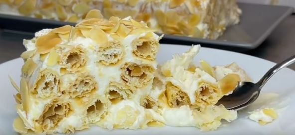 Slatku pavlaku umutite pa joj dodajte žuti krem. Sjedinite sve. Na papiru za pečenje premažite bogat sloj dobijenog fila. Preko njega ređajte pečeno, lisnato testo i filujte do utroška materijala. Zatim umotajte tortu u papri za pečenje i stavite je da se dobro ohladi u zamrzivač. Nakon toga je pospite listićima badema i servirajte.