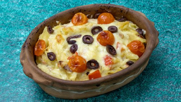 Priprema: Skuvajte testeninu po izboru. Napravite bešamel sos. Kašika masti ili putera, kašika brašna i hladno mleko. Mešajte dok se ne zgusne. Ubacite i rastopite kačkavalj. Odložite. Na masti propržite papriku, ljutu papričicu i beli luk. Dodajte gotovu testeninu i bešamel sos.Stavite u posuu za pečenje, izrendajte sir odozgo, i stavite malo seckanih maslina i čeri paradajz. Zapecite u rerni.