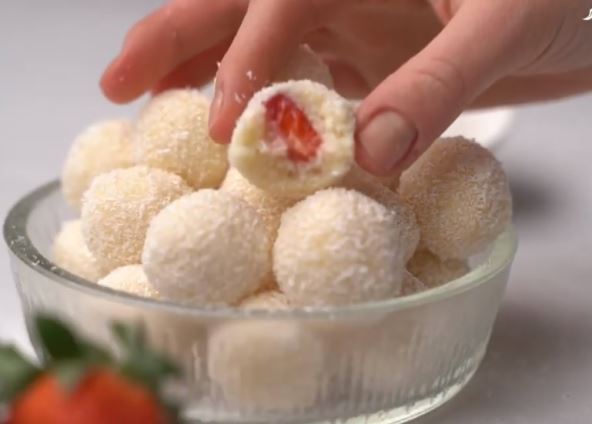 Sastojci: 200 g iseckane bele čokolade, 100 ml slatke pavlake, 100 g kokosovog brašna, 50 g krem sira, 5 jagoda srednje veličine, 50 g kokosovog brašna (za valjanje kuglica).