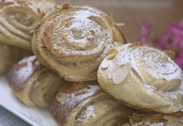 Priprema: Kvasac aktivirati pa umesiti testo. Ostaviti da naraste. Za to vreme skuvati nadev. Razviti testo pa namazati odozgo nadev, posuti listićima badema urolati i iseći. Premazati žumancem i posuti bademovim listićima. Peći na 180 stepeni 25 minuta. Prijatno!