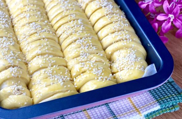 Priprema: Aktivirati kvasac, zatim umesiti glatko testo. Ostaviti da naraste, staviti fil i napraviti oblike. Premazati žumancem i posuti susamom.