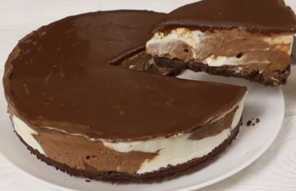 Na kraju stavljajte oba krema na podlogu kako je pokazano u videu ispod. Površinu torte ujednačite pa premažite otopljenom čokoladom. Stavite je u zamrzivač na nekoliko sati, a izvadite 20 minuta pre posluživanja.