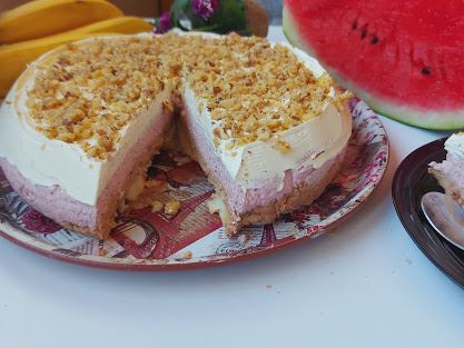 Priprema: Umutiti kiselu pavlaku sa šećerom u prahu i vanilom. Slatku pavlaku takođe umutiti pa sve spojiti. Podeliti na 2 dela.U jednu dodati mleveni keks i 3-4 kašike mleka, a u durgu mlevene orahe i rastopljenu čokoladu i ekstrate maline ili jagode. Sve dobro izjednačiti. Okrugli pleh prečnika 24 cm obložiti prozirnom folijom.