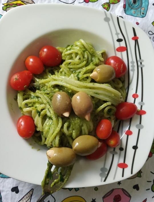 Priprema: Skuvajte testeninu i procedite je. Operite bosiljak, listiće odvojite i stavite u blender, zatim im dodajte badem, maslinovo ulje i so. Sameljite sve dok ne dobijete pastu. Dodajte malo vode, ako je smesa previše gusta. Smesu preručite u testeninu, dodajte izrendan kačkavalj, pa poslužite uz čeri paradajz i masline.