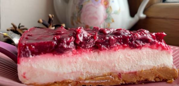 Neodoljiva slatko kisela poslastica sa višnjam, sirom i mlevenim keksom, idealna za sve ljubitelje voćnih i osvežavajućih slatkiša.