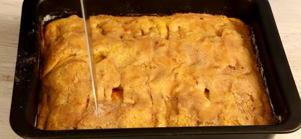- Polovinu sipajte u podmazan pleh, poređajte voće, prekrijte ostatkom testa i pospite mešavinom šećera i cimeta.