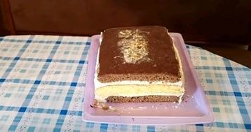 Slagati tamna kora/pola fila / biskvit žuti / fil druga polovina / tamna kora / Može glazura čokolade ili prah šećer.