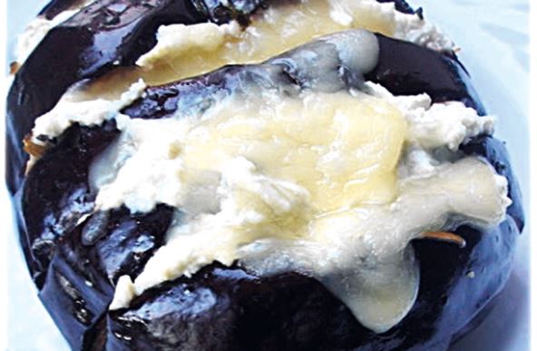 Bosiljak i peršun sitno iseći, pobiberiti i posoliti. Beli luk iseći na režnjeve. Patlidžan dobro oprati i nožem ga zaseći na više mesta. U svaki zasek staviti mešavinu bosiljka i peršuna i prepolovljen čen belog luka. Sitni sir i izrendani trapist pomešati (ostaviti malo narendanog trapista za posipanje odozgo). Ovom smesom polako puniti režnjeve vodeći računa da patlidžani ne puknu napola. Tako pripremljene staviti ih u tepsiju, poprskati uljem i peći oko 40 minuta na 180 stepeni. Na kraju ih posuti ostatkom rendanog sira i vratiti u rernu da se zapeku.