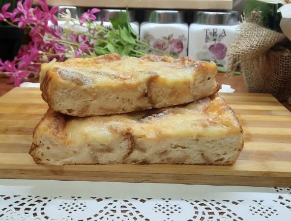 Priprema: Hleb iseći na sitne komadiće, zatim umutiti jaja, sir, vodu i prašak za pecivo pa preliti preko hleba. Sjediniti smesu. Presuti u pleh za pečenje i premazati uljem. Peći na 200 stepeni 15-20 minuta. Prijatno!