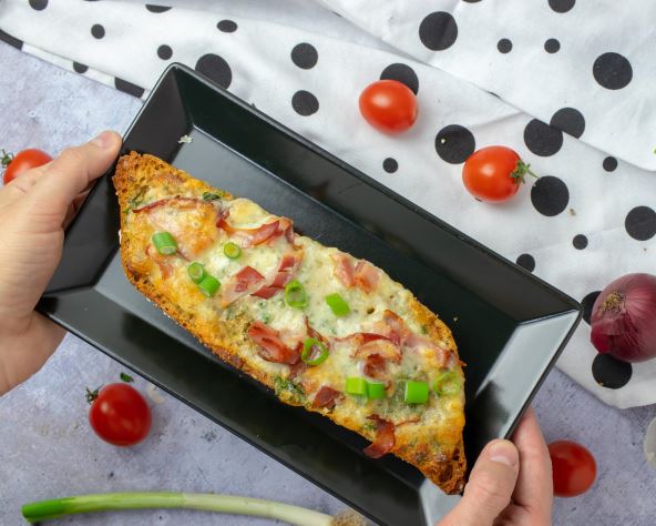 Namažite preko hleba, dodaje suvog mesa i preko pospite rendanim kačkavaljem. Zapecite u rerni na 220c -10-15 minuta.