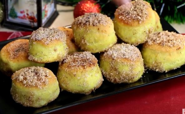 - Vrele poprskajte vodom, uvaljajte u šećer, cimet i orahe.