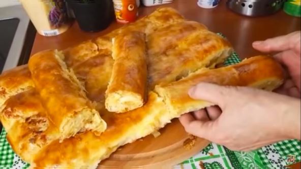 Sastojci: 650 grama brašna, 10 g kvasca, 1 kašika šećera, ravna kašičica soli, 200 ml mlake vode, 200 ml mlakog mleka, 90 ml ulja, 700-800 praziluka, 150 ml ulja, 50 ml soka od paradajza, 1-2 kašičice mlevene paprike, 1 kašičica soli, 200 g rendanog kačkavalja, 2 žumanceta, malo mleka, malo ulja.