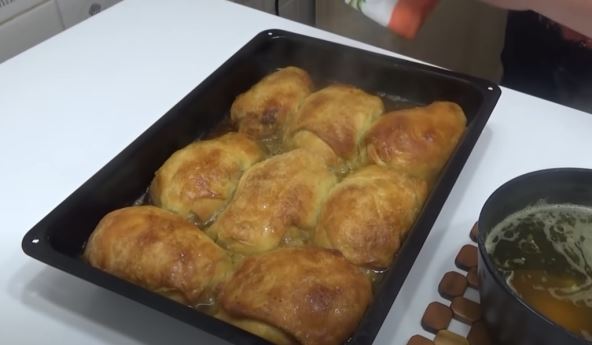 Koru rastanjite pa je isecite na veće kocke. U svako polje stavite po karabatak ili batak sa filom, umotajte i takav smotuljak stavljajte u pleh koji ste namazali sa masti.