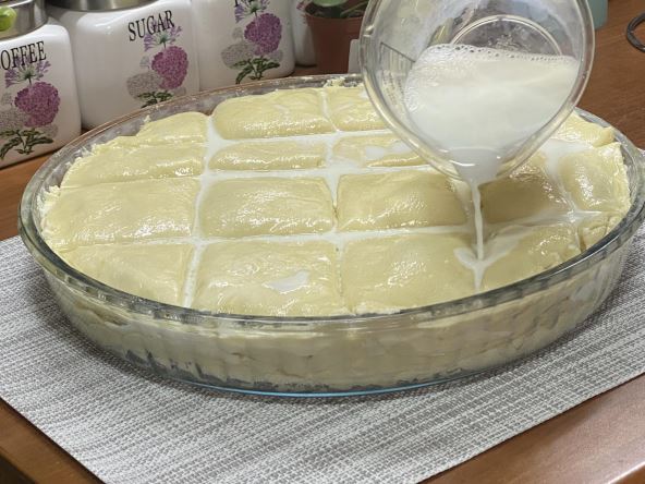 Priprema: Umesiti glatko testo, razviti kore i redjati u vatrostalnu posudu, filovati svaku koru i premazivati maslacem. Iseći na kvadratiće, preliti mlekom i peći na 200 stepeni 30-35 minuta. Prijatno!