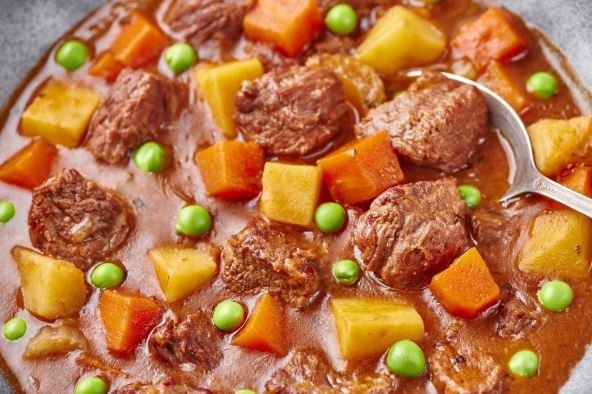 Potrebno je: 1 glavica crnog luka, 2 čena belog luka, 1 šargarepa, 2 krompira, 350 grama junetine seckane na kockice, so i biber, suvi začin, mirođija, 400 grama graška, 1 kašika masti.