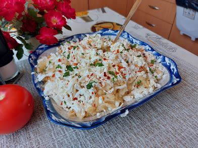 Priprema: Testeninu skuvati u posoljenoj vodi. Ocediti i staviti u nju 1 kašiku maslinovog ulja, izmešati da se testeo ne slepi. U šerpu staviti ulje, dodati prezle pa propržiti da porumeni, dodati pavlaku, kačkavalj. Kad se malo istopit dodati testeninu pa sve izmešati. Servitati u dublji tanjir pa izrendati sir po vrhu.