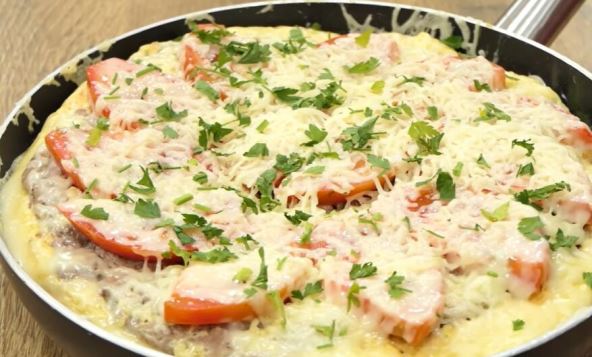 Mleveno meso posolite, pobiberite, začinite kimom, timijanom i sitno seckanim crnim lukom. Sipajte i 100 ml mleka. Dobro promešajte. Sipajte u tiganj malo ulja, pa rasporedite mleveno meso po dnu. Potrudite se da oblikujte krug od mesa, a zatim okrenite da se isprži i druga strana. Preko stavite kriške hleba. Jaja posolite i pobiberite i dodajte150 ml mleka, pa umutite. Prelijte preko hleba. Poklopite i pecite 6 minuta na laganoj vatri. Zatim ponovo okrenite i poređajte kriške paradajza, pospite rendanim sirom i ponovo poklopite. Ostavite 3 minuta na laganoj vatri.