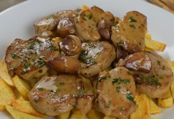 Beli luk očisite i presecite po sredini, ali ne do kraja (čenovi treba da ostanu celi). Sa mesa skinite masnoću i isecite šnicle debljine 2 cm. Propržite meso na zagrejanom ulju, pa izvadite. Stavite luk, kratko propržite, pa vratite meso. Sipajte vino i vodu (bujon) i ostavite još 5 minuta da se krčka. Pospite seckanim peršunom.