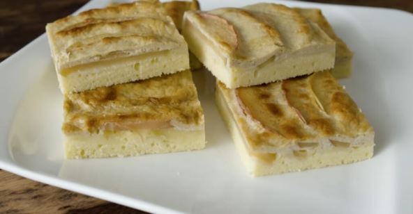 Puter umutite sa pola količine šećera u prahu, pa postepeno dodajte jaja. Posle svakog dodavanja umutite. Dodajte ostatak šećer i umutite, a potom i koru limuna i brašno. Sjedinite mikserom. Sipajte u pleh obložen pek papirom i poravnajte. Jabuke očistite i isecite na kriške, pa poređajte po testu. Kiselu pavlaku umutite sa jajima, šećerom i cimetom. Sipajte preko jabuka. Pecite na 180°C oko 35 minuta.