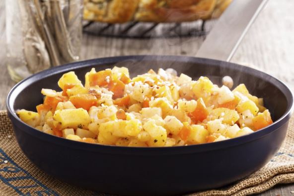 Krompir očistite, operite i isecite na režnjeve debljine pola centimetra, pa ga kuvajte u posoljenoj vodi oko deset minuta i procedite. Operite i očistite patlidžan, tikvicu, papriku i paradajz. Papriku isecite na trake. Patlidžan i tikvicu na kolutiće, a paradajz isecite na četvrtine. Luk oljuštite i iseckajte na kockice. Papriku, patlidžan i tikvicu blanširajteu vodi 2–3 minuta, izvadite, ocedite, prelijte hladnom vodom i ponovo ocedite.