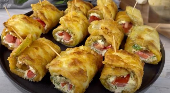 - Premažite ih smesom sa sirom, pa stavite preko iseckani paradajz i urolajte.