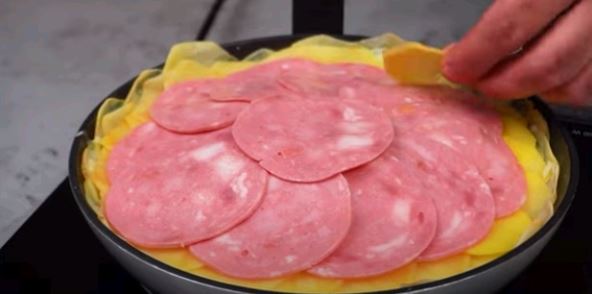 Prvo zagrejte ulje i puter, a potom krenite u krug da slažete red krompira, red šunke, red luka, red mocarele. Poklopite i pržite 15 minuta s jedne strane. Okrenite pomoću tanjira, a potom pržite sve i 15 minuta s druge strane poklopljeno.