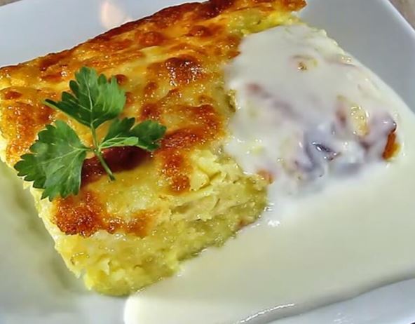 Ulupati jaja žicom sa pola kašičice soli i na vrh kašičice bibera. Dodati brašno, pa opet dobro umutiti. Na kraju dodati mleko, izmešati, preliti svuda po krompiru. Kada prelijete, malo kašikom utapkajte, kako bi sav krompir bio u prelivu.