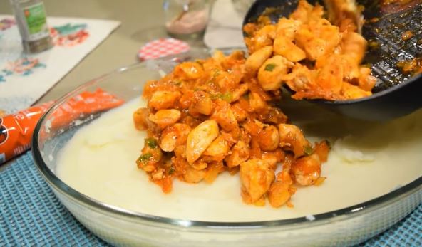 Krompir izgnječite kao za pire, pa posložite u jedan sloj u vatrostalnu činiju. Preko njega dodajte piletinu, a preko rendan sir. Zapecite u rerni i poslužite! Uživajte!