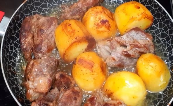 Priprema: Meso posoliti pa na vrelo ulje staviti da se zapeče. Pažljivo ga okretati čas s jedne, čas s druge strane. Zatim krompir očistiti i začiniti. Dodati u vrelu masnoću gde se peče meso. Smanjiti temperaturu, pa poklopiti. Povremeno okretati s jedne i druge strane i krompir i meso, dok sve lepo ne porumeni.